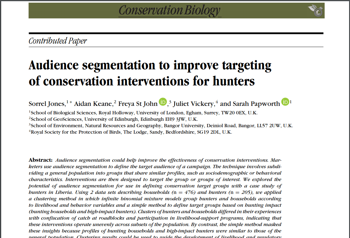 Abstract Audience segmentation could help improve the effectiveness of conservation interventions. Marketers use audience segmentation to define the target audience of a campaign. The technique involves subdividing a general population into groups that share similar profiles, such as socio-demographic or behavioural characteristics. Interventions are then designed to target the group or groups of interest. We ...